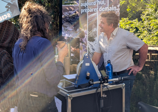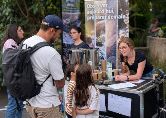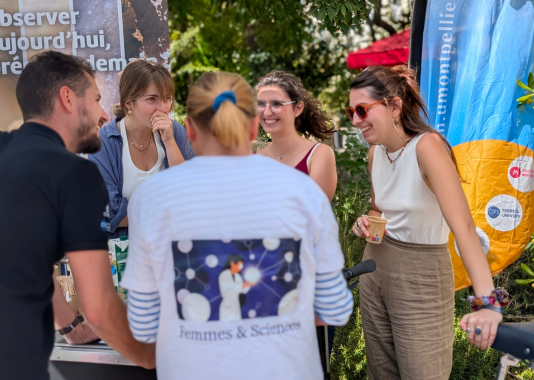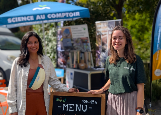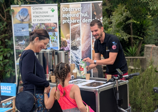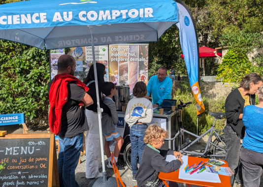 Samedi 4 octobre, à la Fête de la Science Montpellier, un bar pas comme les autres a attiré la foule du Village des Sciences. Derrière le comptoir ? Pas de baristas… mais des scientifiques ! Treize membres de l’Université de Montpellier et du CNRS issus des laboratoires Géosciences Montpellier (GM), HydroSciences Montpellier (HSM), Centre d’Écologie Fonctionnelle et Évolutive (CEFE) et Laboratoire Univers et Particules de Montpellier (LUPM), se sont relayés toute la journée pour servir cafés, jus de pommes et surtout… conversations scientifiques.